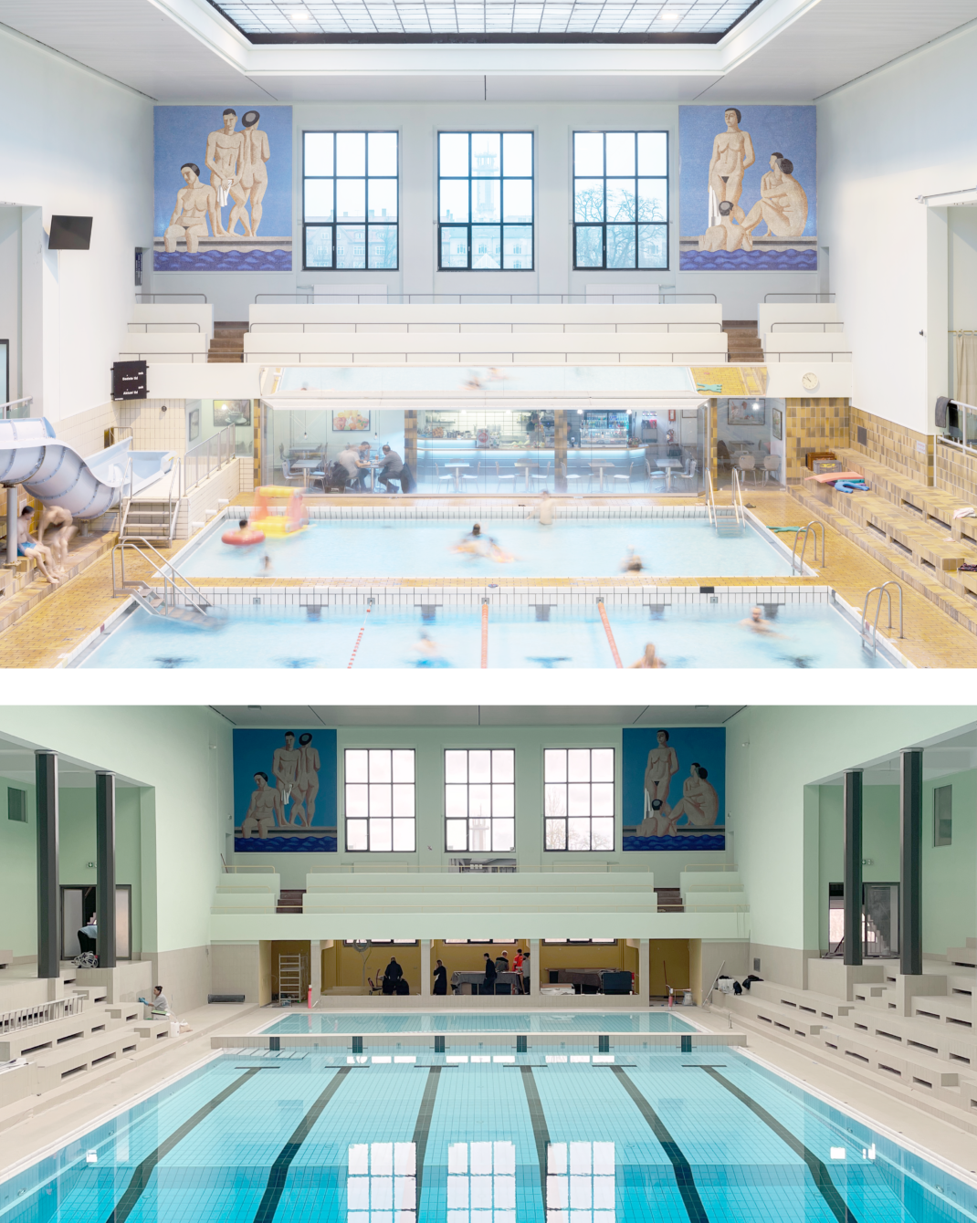 Between 2021 and 2024, the swim hall went through an extensive renovation led by Cornelius Vöge, which thoughtfully restored original elements, signage, colour schemes, and the original café.