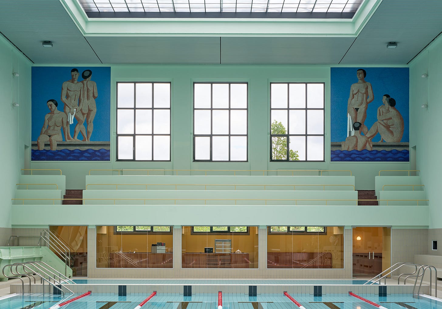 The swimming hall is naturally the heart of the building. From the spectator viewing deck, you get a full view of the space. Each of the four corners of the hall is anchored by massive, three-metre-tall tiled mosaics by Vilhelm Lundstrøm. Standing on the viewing deck, you are directly beneath them, looking up and noticing the fine grain of the small tiles that make up each piece. The towels carried by the figures almost glow, catching the light from the skylight and large exterior-facing windows.
