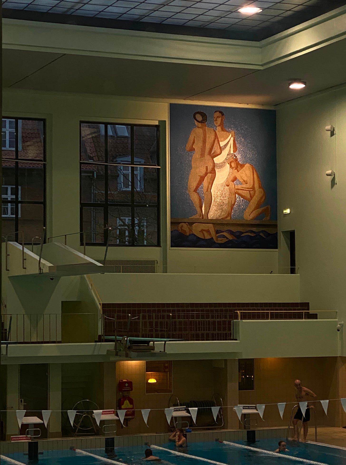 One of the most special swimming halls I’ve visited has to be Frederiksberg Svømmehal, here in Frederiksberg (a city within the city of Copenhagen) — one of Denmark’s oldest and most charming public pool buildings. It was designed by architect A.S.K. Lauritzen and opened in 1934 as a civic swimming bath and hygiene facility at a time when private bathrooms were not common in homes. The building is a great example of Danish functionalist architecture and features monumental mosaics by Danish artist Vilhelm Lundstrøm.