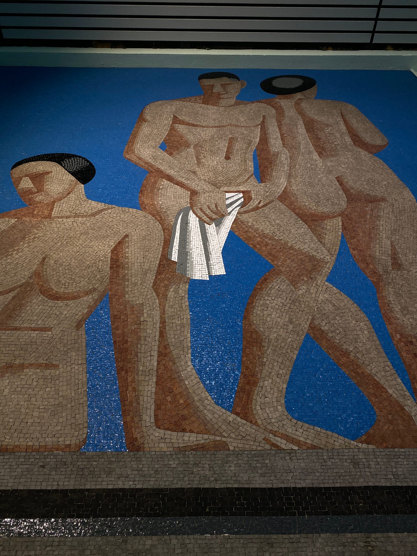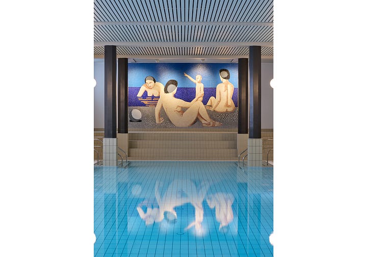 Lundstrøm was a highly notable Danish painter, best known for his still lifes and portraits — many of which can be seen at the SMK and around Finn Juhl’s house. This was his only large-scale public mosaic commission, supported by the Ny Carlsbergfondet. His painterly style translates surprisingly well into mosaic and really defines the space. Even though the swim hall was built as a very practical place for hygiene and exercise, the decision to integrate art clearly shows the intention to elevate the experience and make even this everyday ritual feel special.