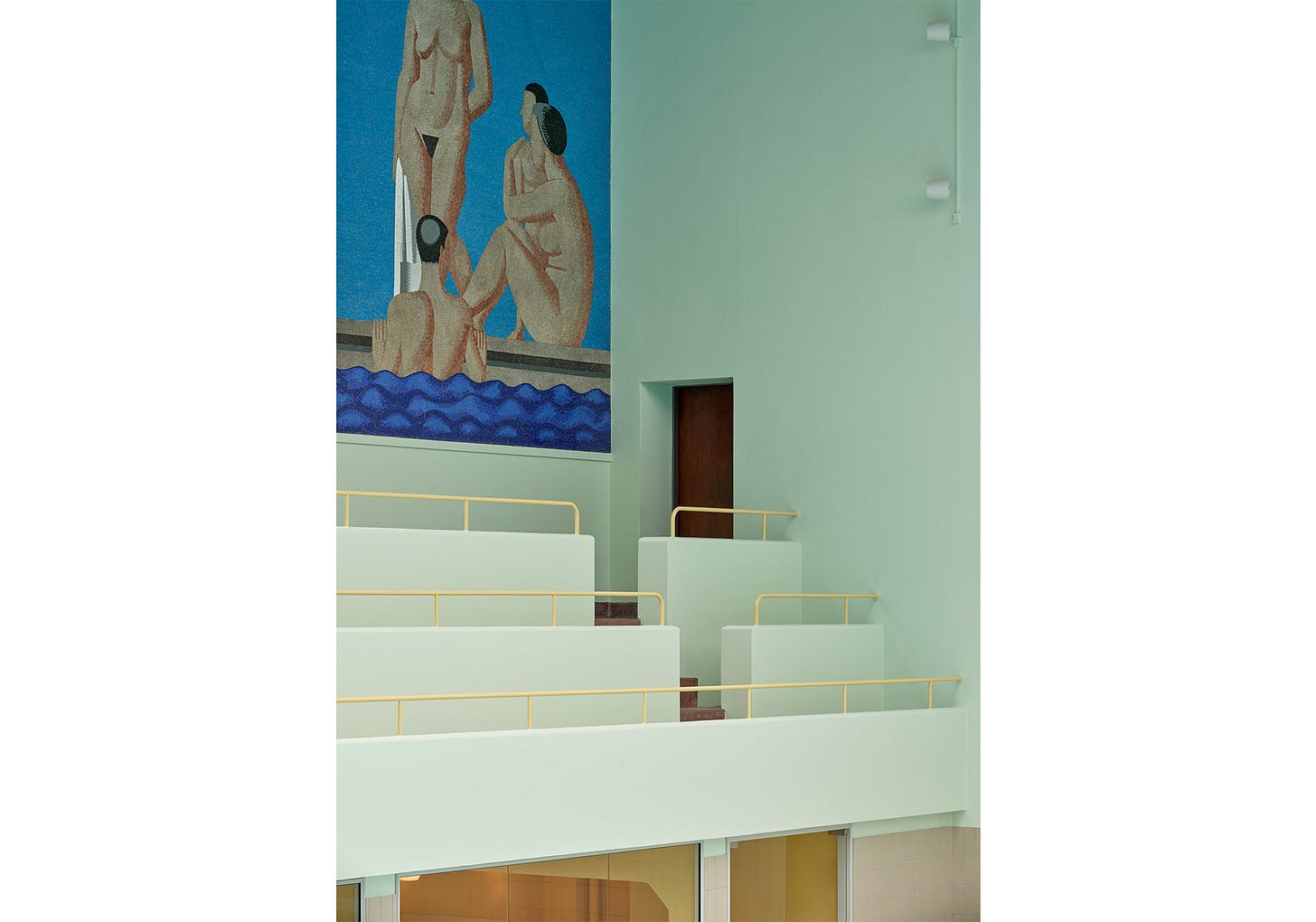 The colour story throughout the viewing deck continues to be fascinating: yellow curved metal handrails, teal walls, red tiled floors. It all works remarkably well. It’s fascinating that this is the original palette from the 1930s — almost 100 years old now — and still feels so mature and finished, yet fun, playful, and familiar at the same time. In the pool space, there are two stepped viewing platforms framed by tall columns, subtly referencing Roman bath architecture and reinforcing the ceremonial, historic, and monumental quality of the space.