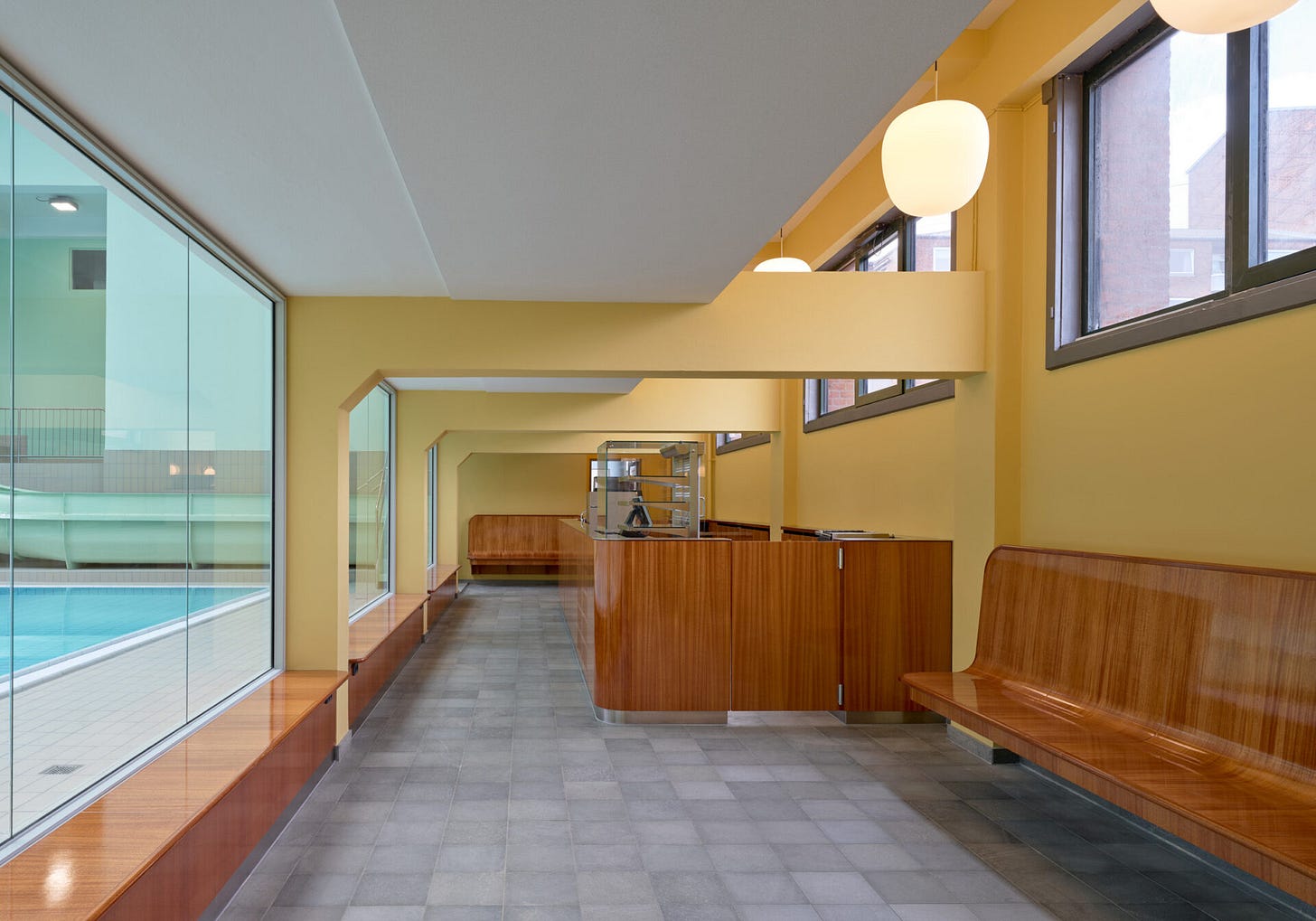 Moving through the building, you pass into the ground-floor cafeteria, which has been restored to its original character and looks directly onto the pool deck. The yellow interior and warm wood details contrast beautifully with the blues and teals of the pool hall and water beyond the windows. I especially love this photograph from the opposite side of the swim hall, where the café colours sit opposite the pool space — it’s such a strong and fun palette.